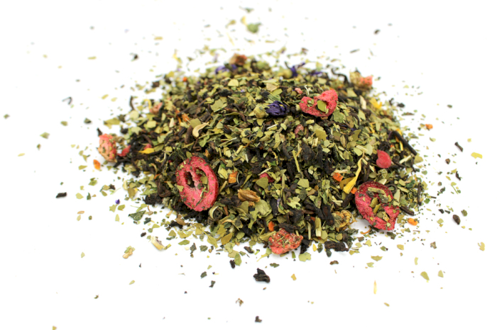 Pure red tea (Rooibos), mate leaves, nettle leaves, carrot pieces, freeze-dried blueberry, calendula petals, mallow flowers, freeze-dried strawberry, freeze-dried raspberry, natural flavouring