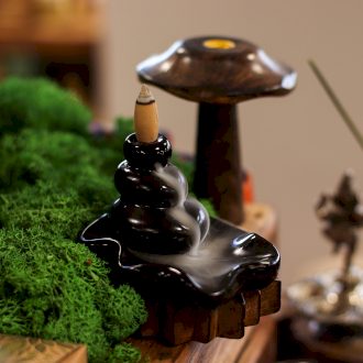 När du tänder en tillbakaflöde rökelsekon och placerar den på brännaren, börjar rökelsen att släppa ut sin doftande rök. Men till skillnad från vanlig rökelse är dess rök tätare än luft. Detta innebär att den istället för att stiga upp, faller ner i virvlar, vilket skapar en vacker dans av rök. Röken strömmar genom hålet i brännaren och sjunker graciöst ner över föremålet nedanför, för att slutligen samlas i botten.