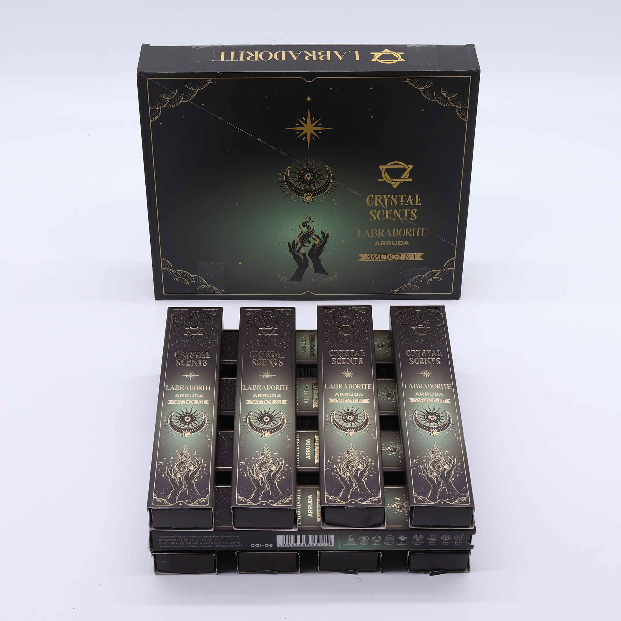 Varje förpackning inkluderar tio handgjorda smudge-pinnar och en äkta Labradoritkristall, vilket gör den idealisk för spirituella butiker och wellness-fokuserade återförsäljare. Kunder väljer ofta denna kombination under övergångsfaser eller när de vill skapa en mer jordad, intuitiv miljö.