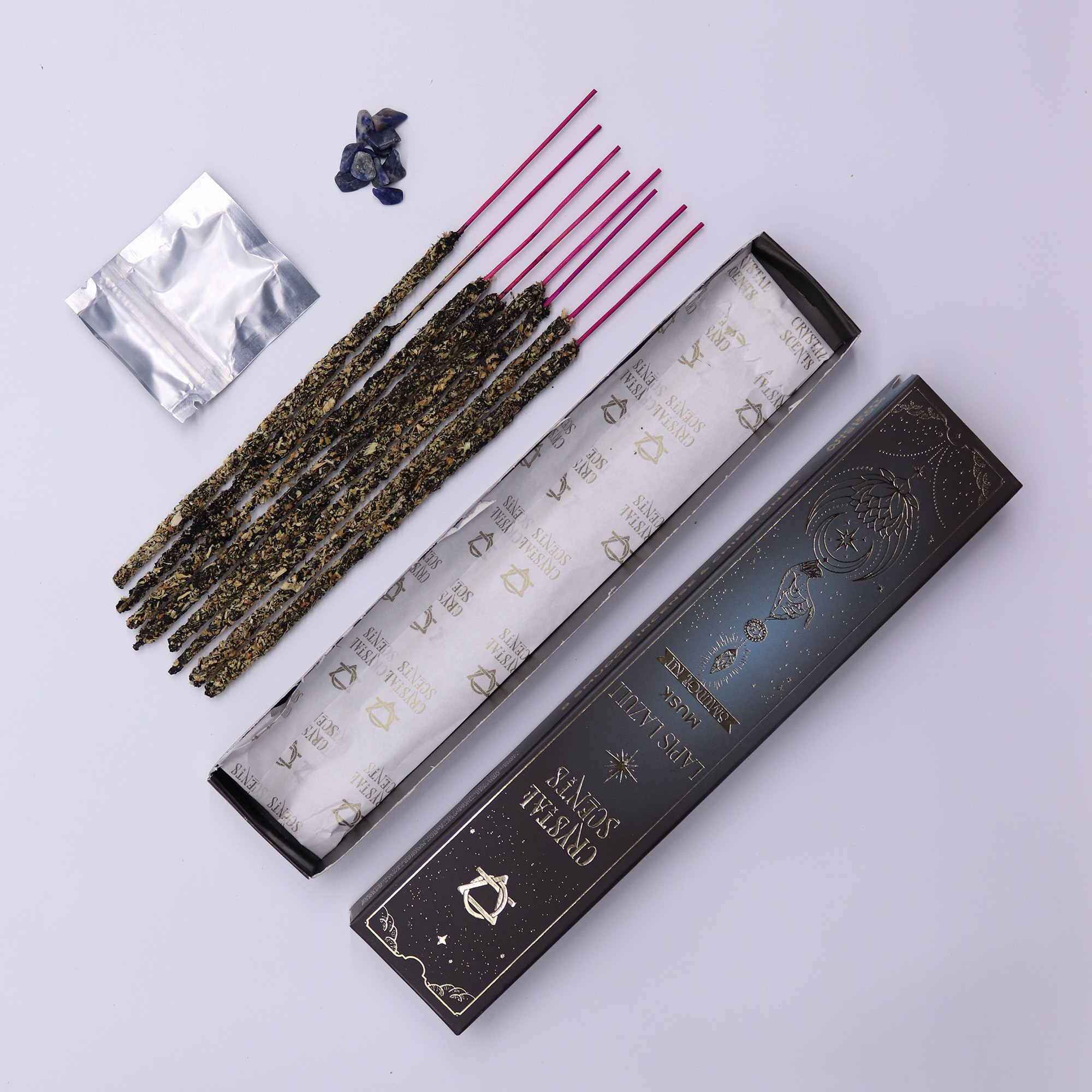 Denna smudge-rökelse blandar klassisk mysk med en Lapis Lazuli kristall, vilket tilltalar kunder som dras till teman som insikt, kommunikation och inre sanning. Lapis är traditionellt kopplad till visdom, klarhet och självuttryck. Många använder den när de vill tala självsäkert, fatta genomtänkta beslut eller fördjupa sin förståelse under meditation eller studier. Den lena, jordande myskdoften förstärker denna reflekterande kvalitet.