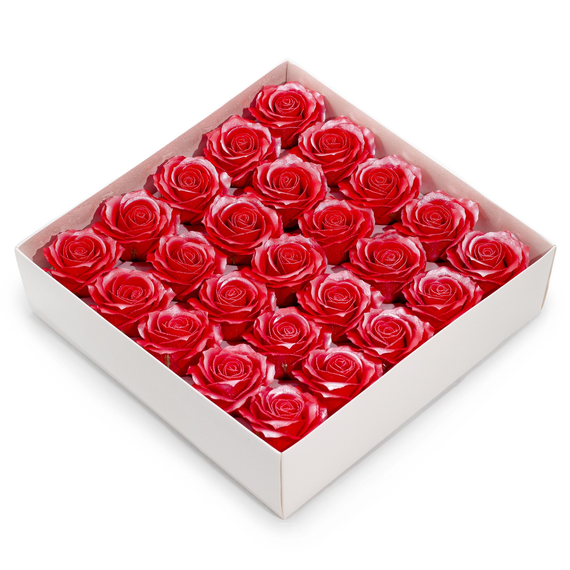 Förnya ditt sortiment med de rika tonerna av Tvålblommor i Frostad Rubin-färg. Varje ask innehåller 25 siden-kantade rosor, tillverkade med lager av delikata kronblad och en slående rubinröd finish. Deras djärva färg och subtila tvåldoft gör dem till ett lyxigt val för utställningar, presentkorgar och kreativa presentprojekt.