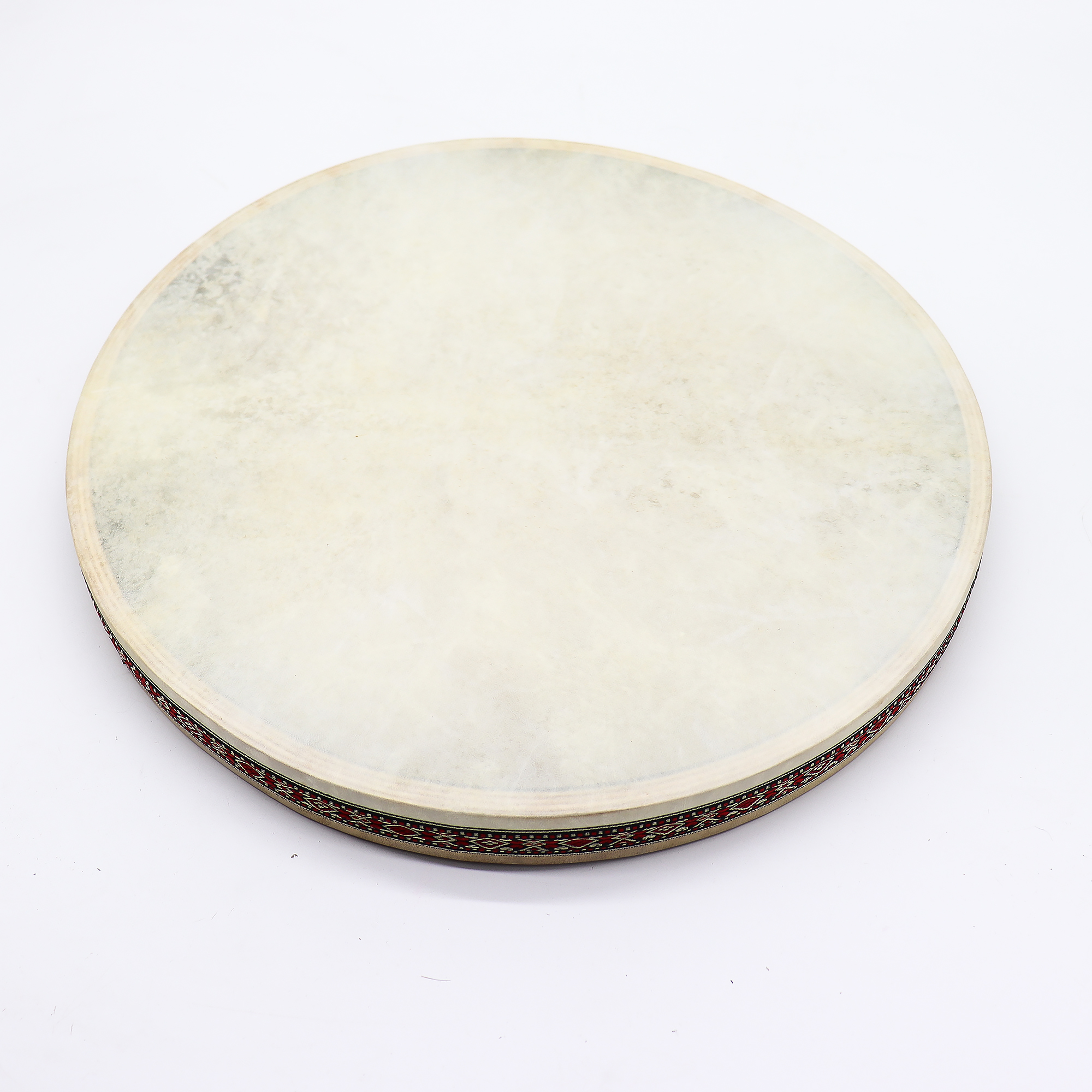 Trumman är handgjord i Indonesien av äkta getskinn sträckt över en vackert dekorerad, mönstrad ram, och kombinerar estetisk dragningskraft med pålitlig prestanda. Dess generösa storlek producerar fylliga, rika toner som uppskattas av professionella ljudhealers, yogainstruktörer och terapeuter som arbetar med grupper.