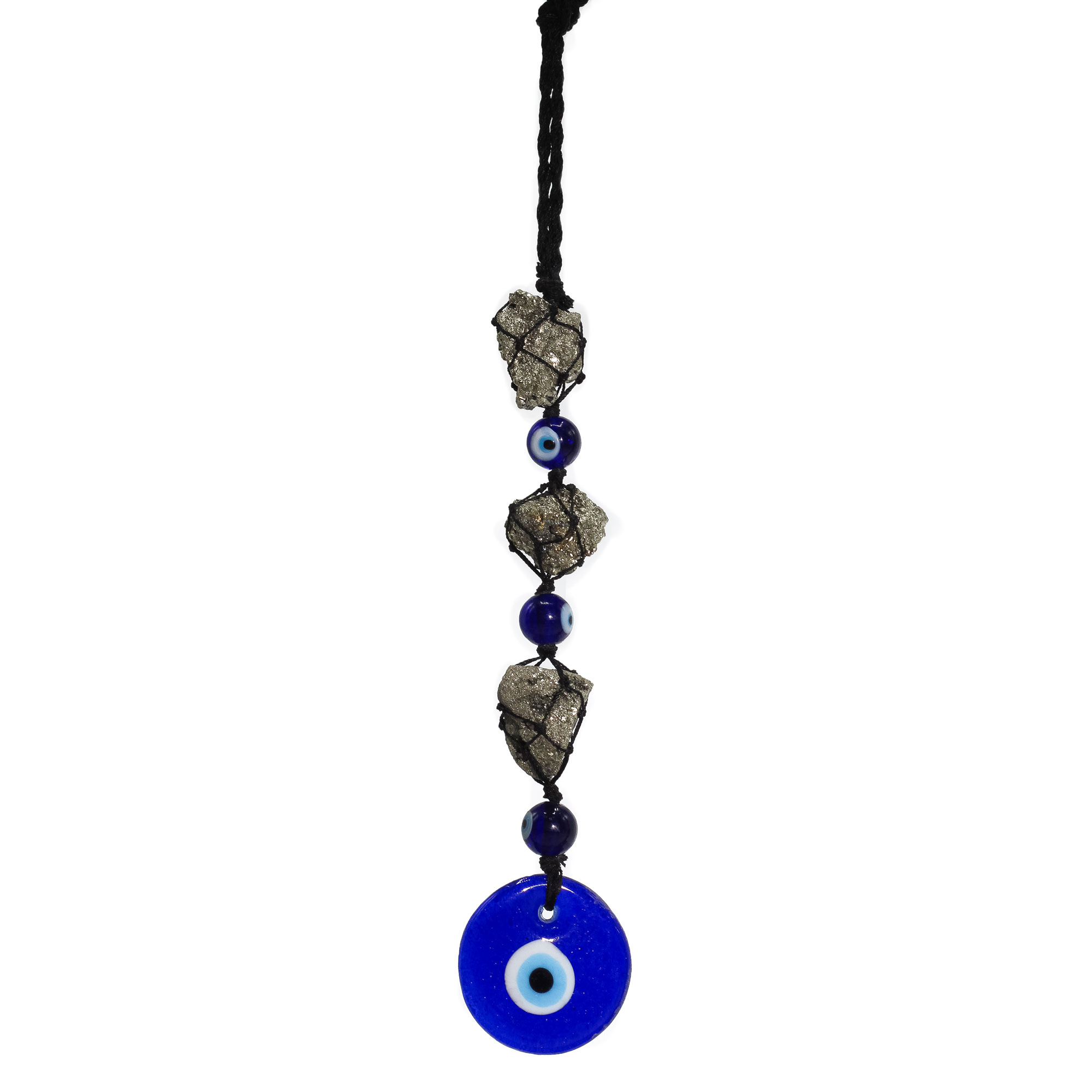 Introducera dina kunder till en produkt som vackert blandar modern design med andlig symbolism – den Hängande Stendekorationen med Pyritstenar & Pärlor som pryds av Onda Ögat.