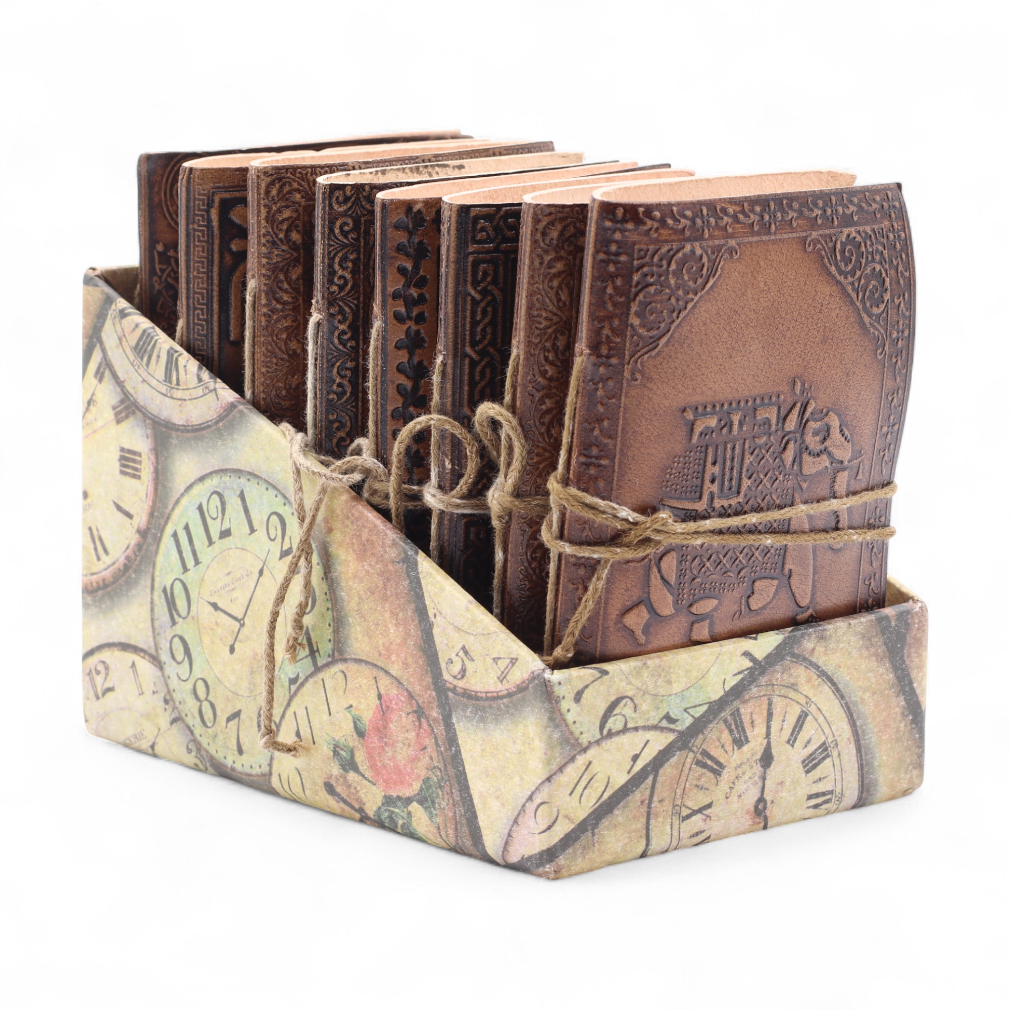 Detta mångsidiga utställningspaket samlar åtta vackert designade esoteriska läderanteckningsböcker i ett kompakt format.