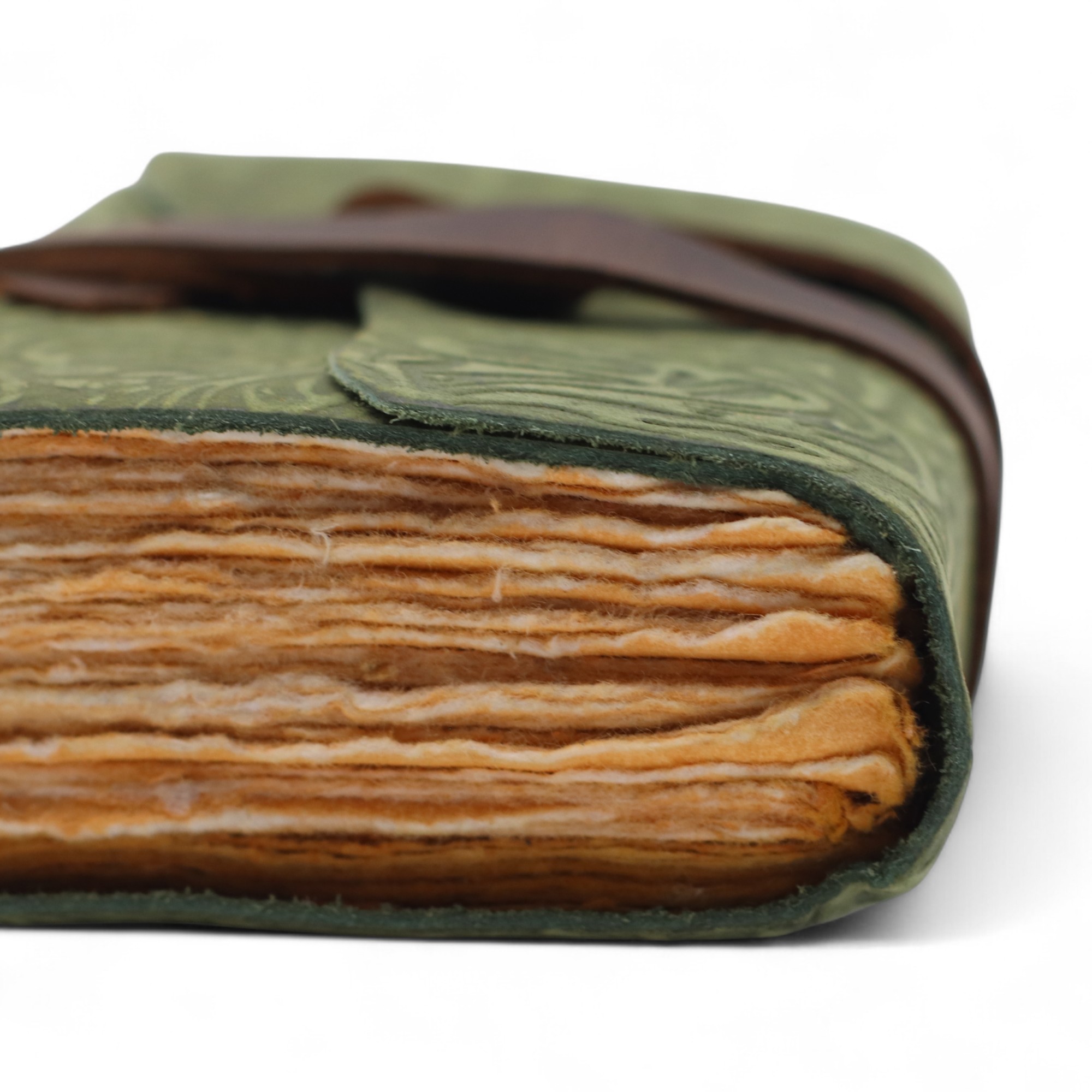 Denna gröna läderanteckningsbok är rikt präglad med ett labyrintmotiv, och fångar essensen av inre utforskning och personlig tillväxt. Labyrintdesignen har länge symboliserat livets resa – en väg av lärande, tålamod och självupptäckt – vilket gör denna anteckningsbok särskilt tilltalande för andliga och meditativa kunder.