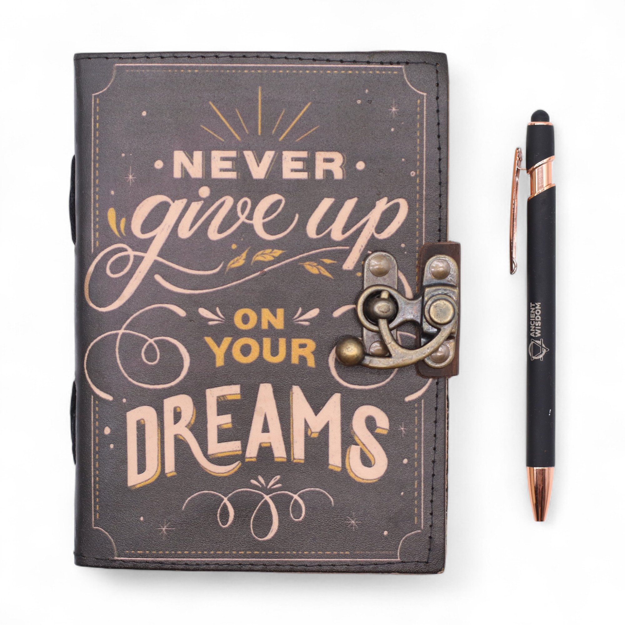 Djärv, motiverande och modern — denna tryckta läderanteckningsbok bär på ett budskap som är universellt: "Never Give Up On Your Dreams".