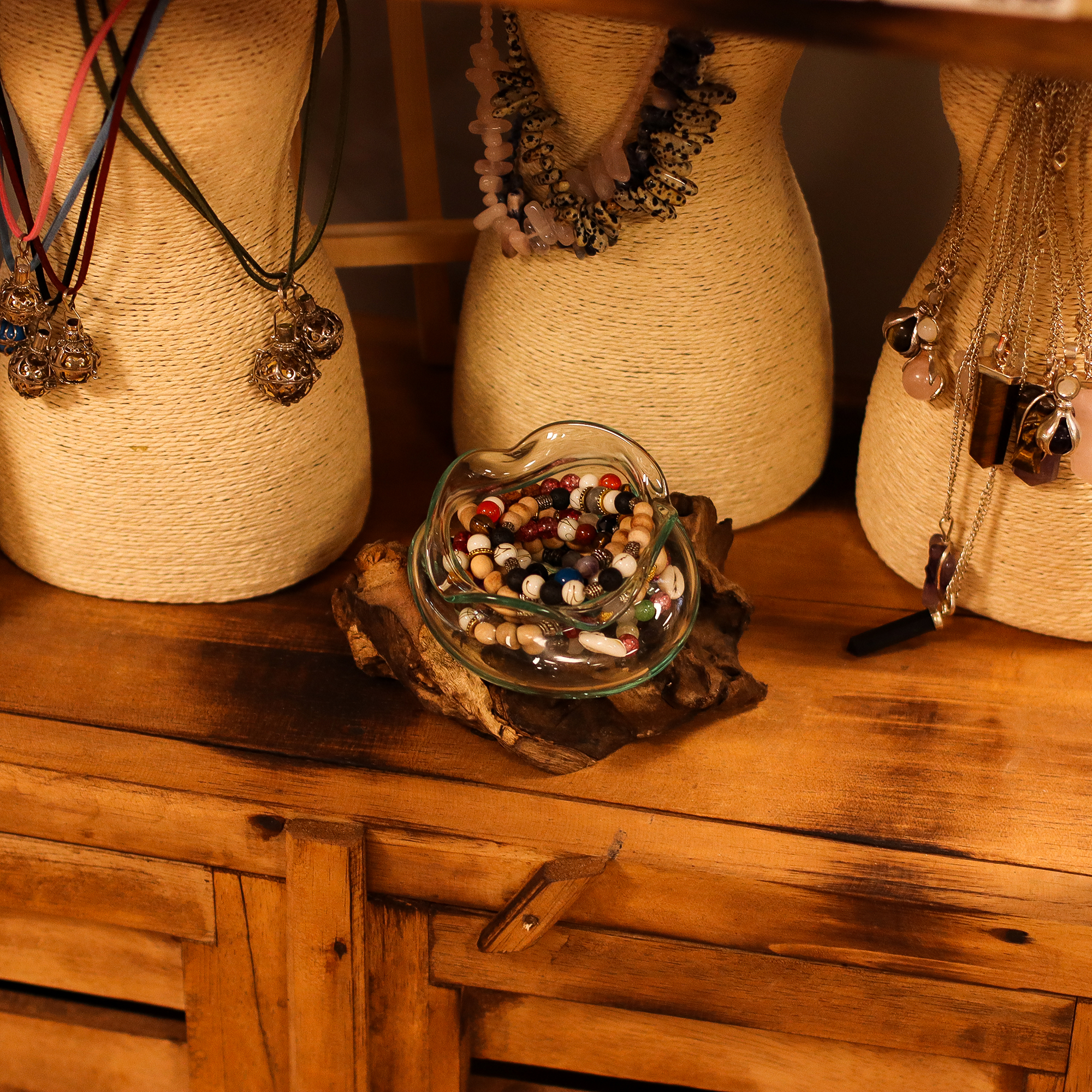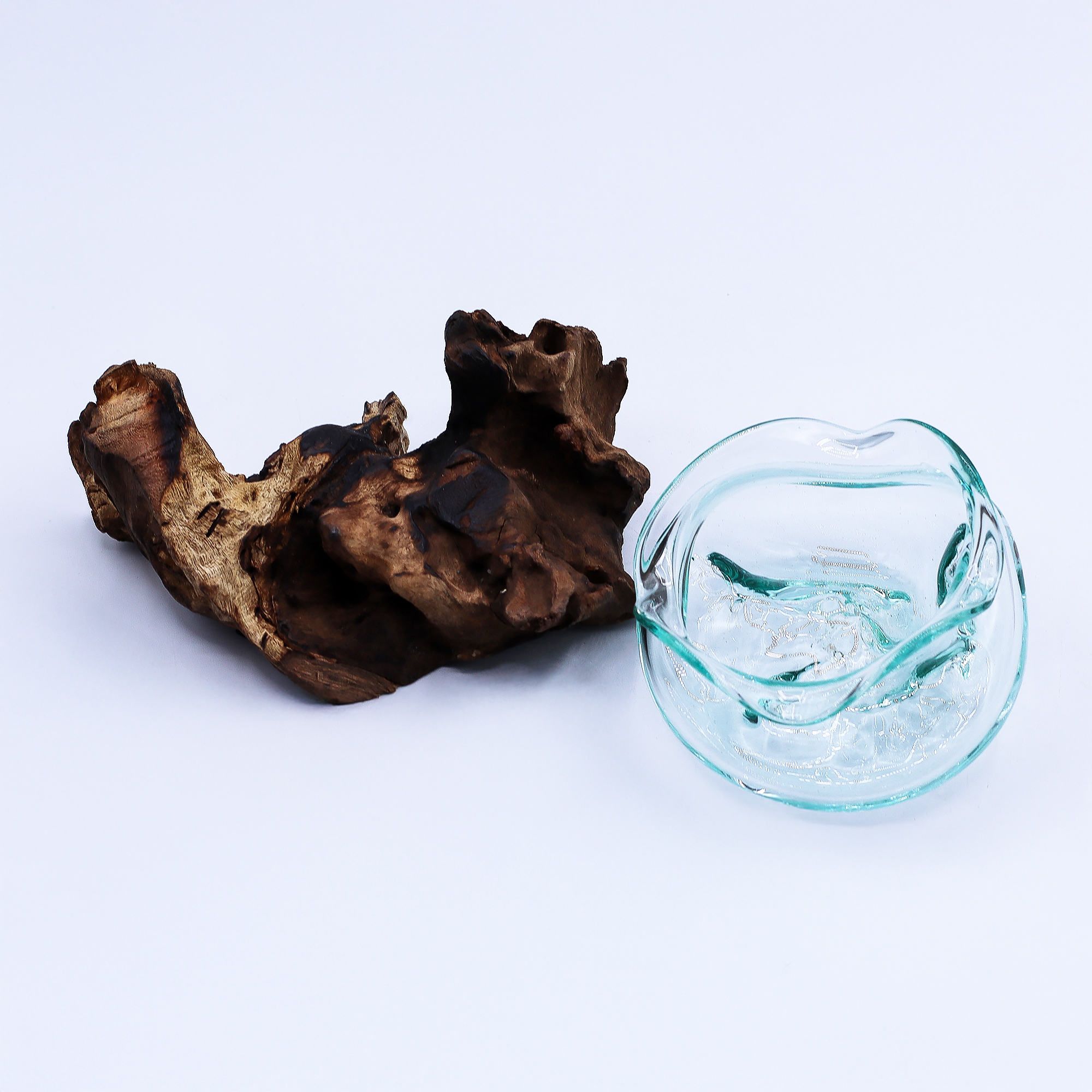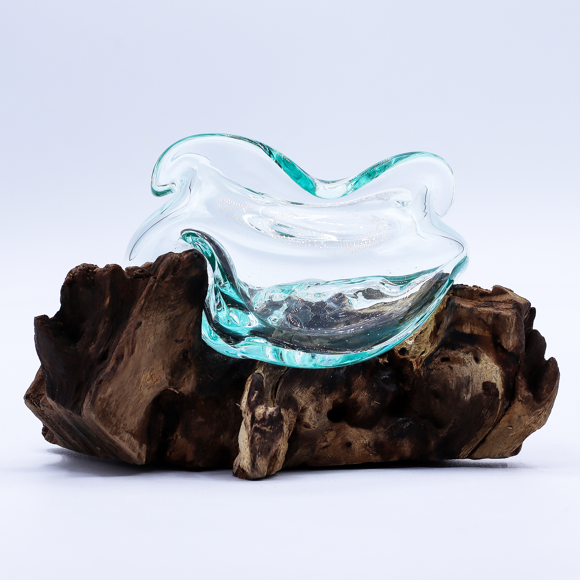 Det smälta glaset formas direkt över träet, vilket skapar eleganta vågor och organiska kurvor som smälter samman sömlöst med basen. Dess skulpturala design inbjuder till mångsidig presentation – perfekt för att hålla värmeljus, flytande blommor, snäckor eller ädelstenar.