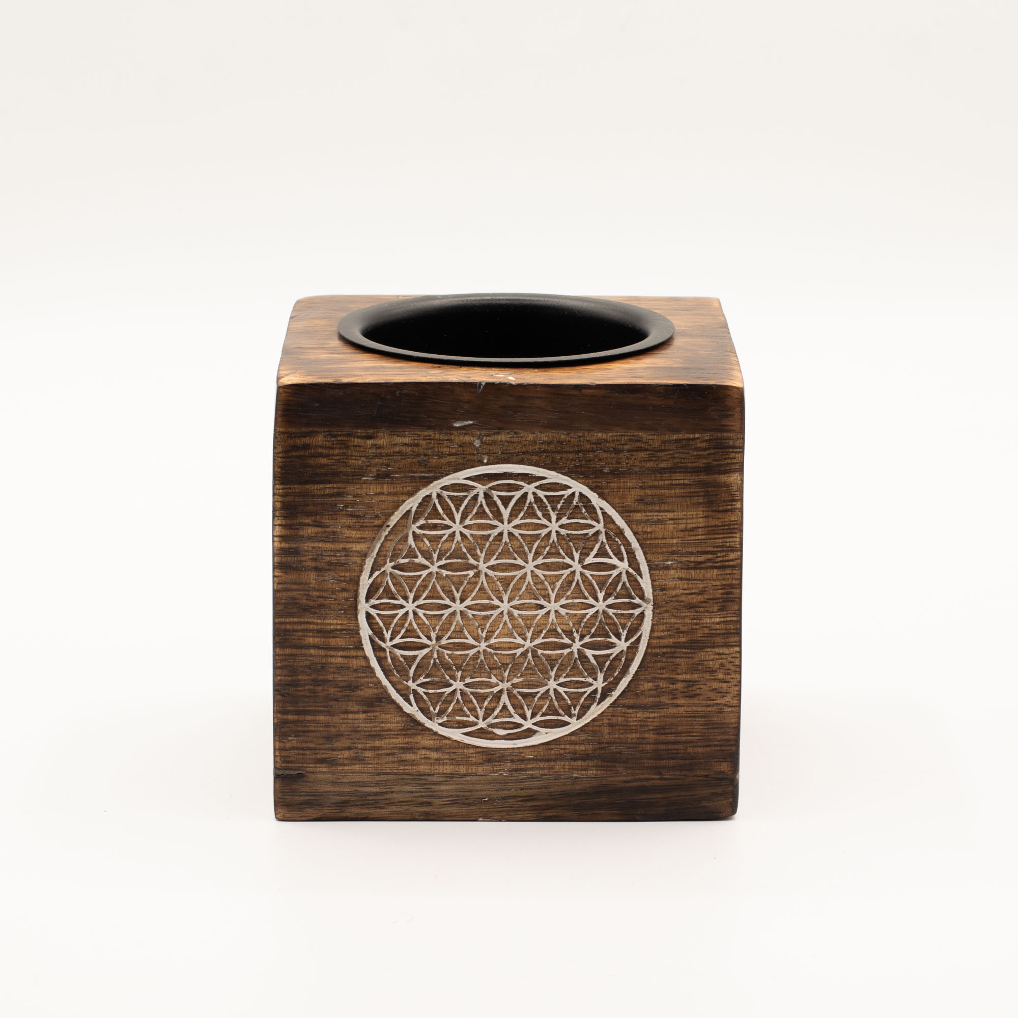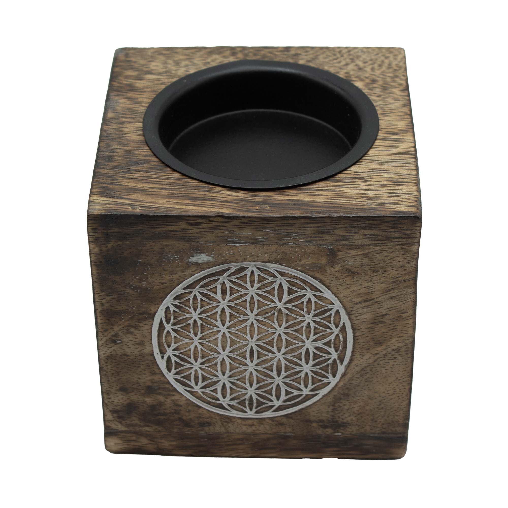 Denna kvadratiska oljebrännare pryds av motivet Livets Blomma, som erbjuder en mer geometrisk och modern design samtidigt som den bär på en djup symbolisk innebörd kopplad till harmoni och skapelse. Varje brännare är tillverkad av mangoträ och passar utmärkt i både moderna och spirituella inredningar.