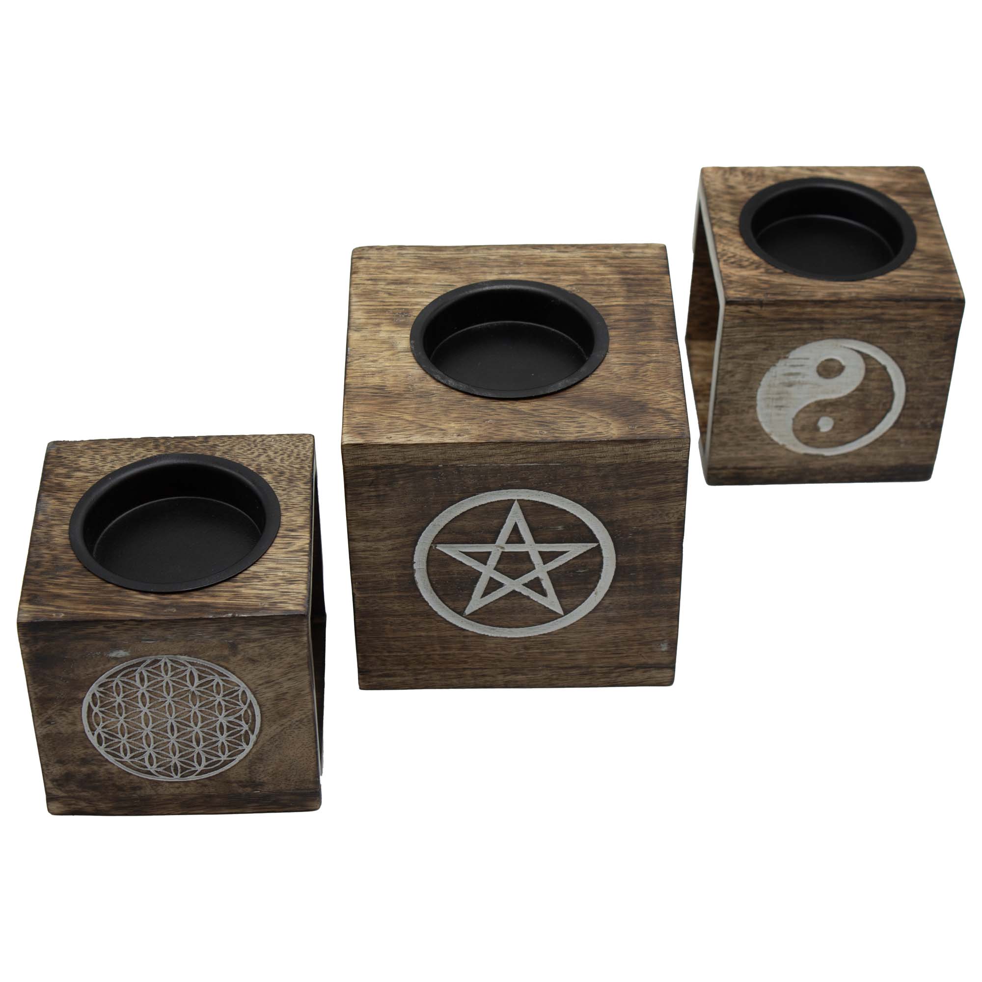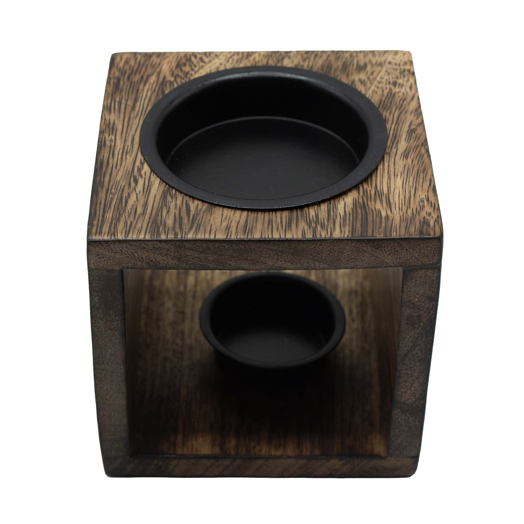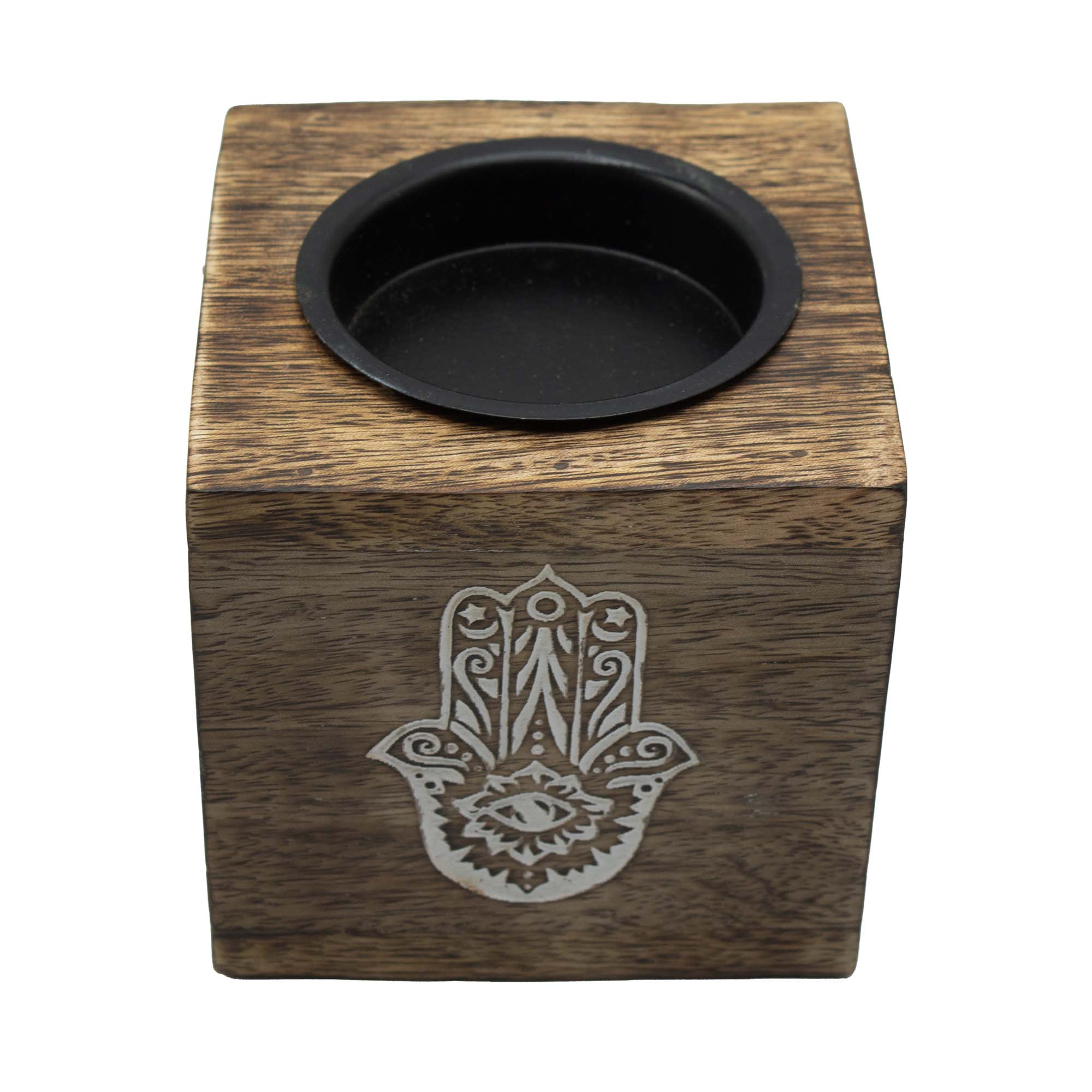 Denna kvadratiska oljebrännare pryds av symbolen Hamsa, som traditionellt förknippas med skydd och positiv energi. Varje brännare är tillverkad av mangoträ och kombinerar en varm, naturlig finish med ett tydligt graverat motiv.