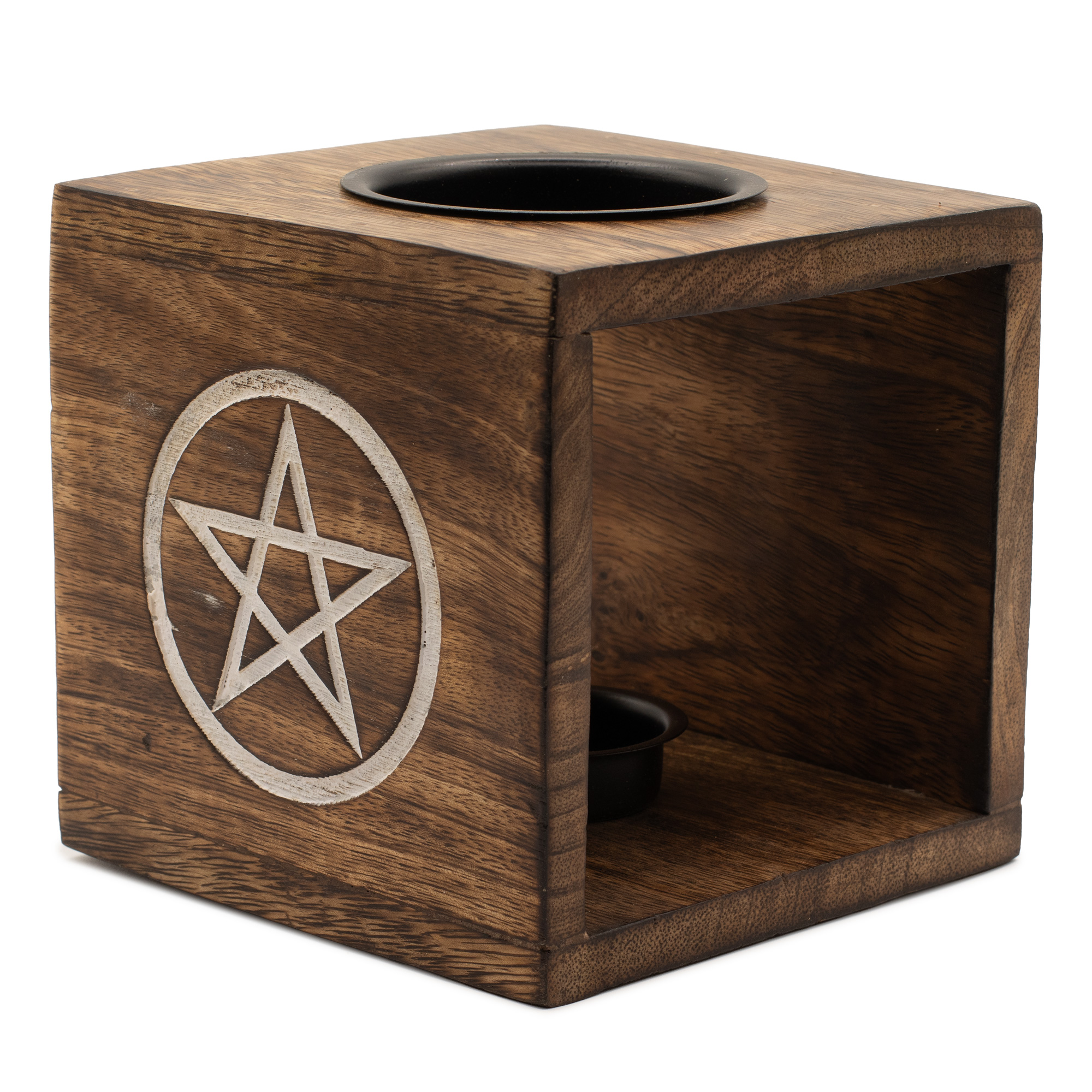 Denna stora, kvadratiska oljebrännare är tillverkad av massivt mangoträ och pryds av en utskuren och målad pentagram-symbol, som förknippas med balans, skydd och de naturliga elementen. Den rena, kvadratiska formen ger ett modernt intryck, medan den graverade designen skapar djup och ett vackert visuellt spel när värmeljuset tänds.