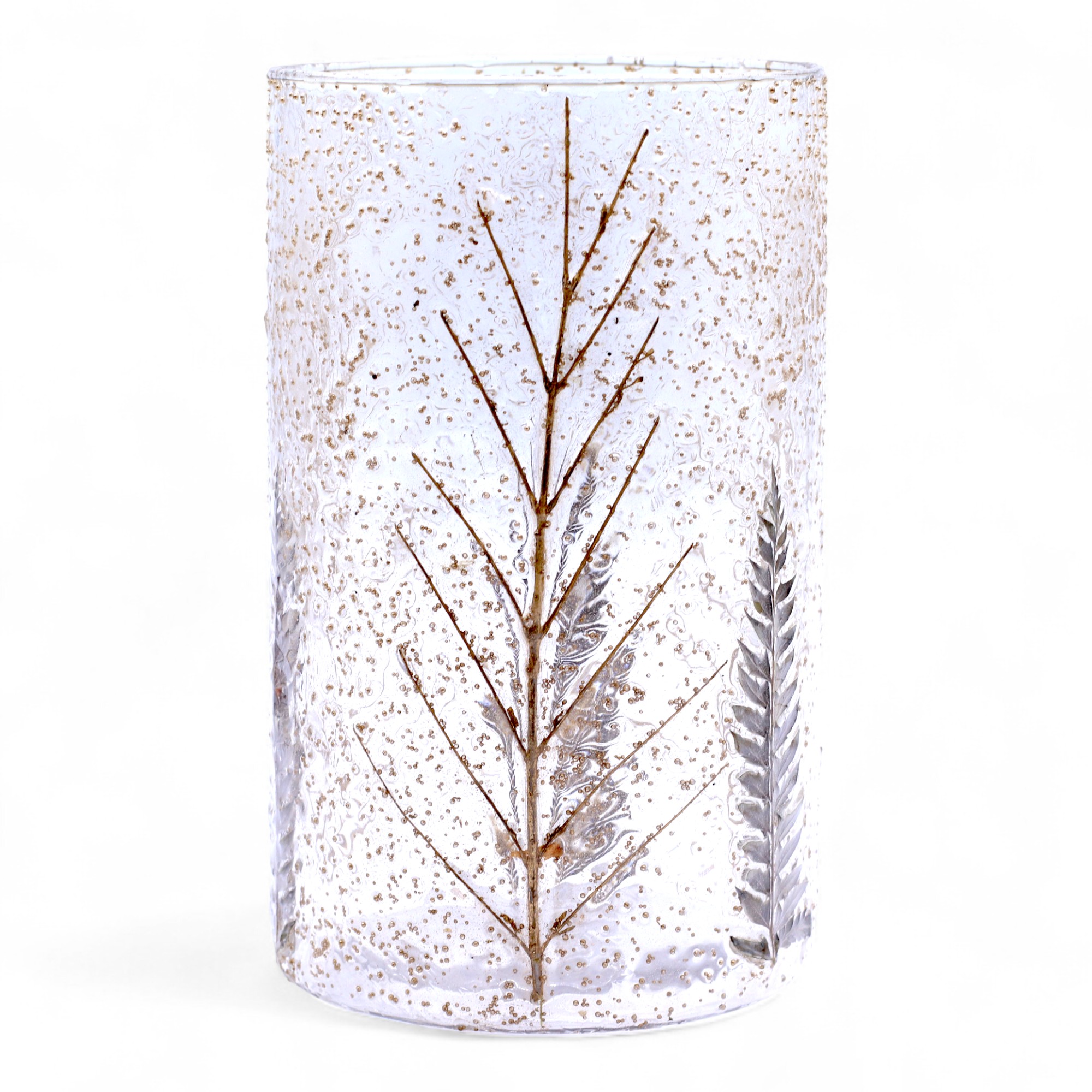 Den Långa Vasformade Ljuslyktan i Naturligt Blommigt Glas med Tall-design visar upp äkta pressade gröna växter inneslutna i återvunnet glas, vilket ger varje lykta en mjuk, naturlig skogs-charm. Det klara glaset framhäver de botaniska detaljerna och erbjuder återförsäljare en slående inredningsdetalj med autentisk visuell dragningskraft.