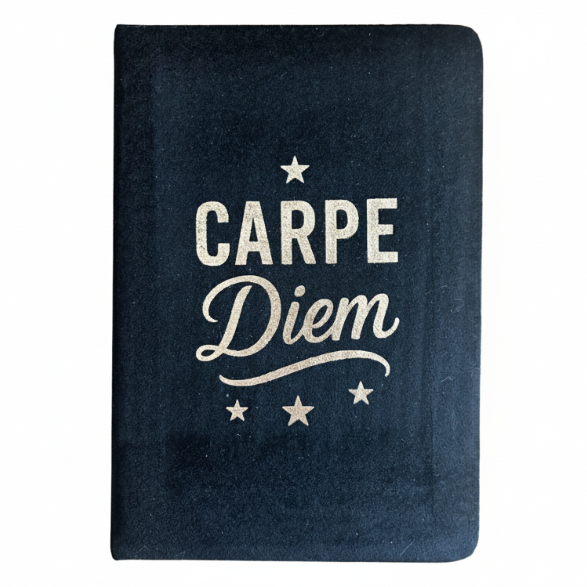 Det mjuka sammetsomslaget, präglat med det inspirerande budskapet "Carpe Diem", gör den till ett utmärkande val för kunder som uppskattar både design och mening.