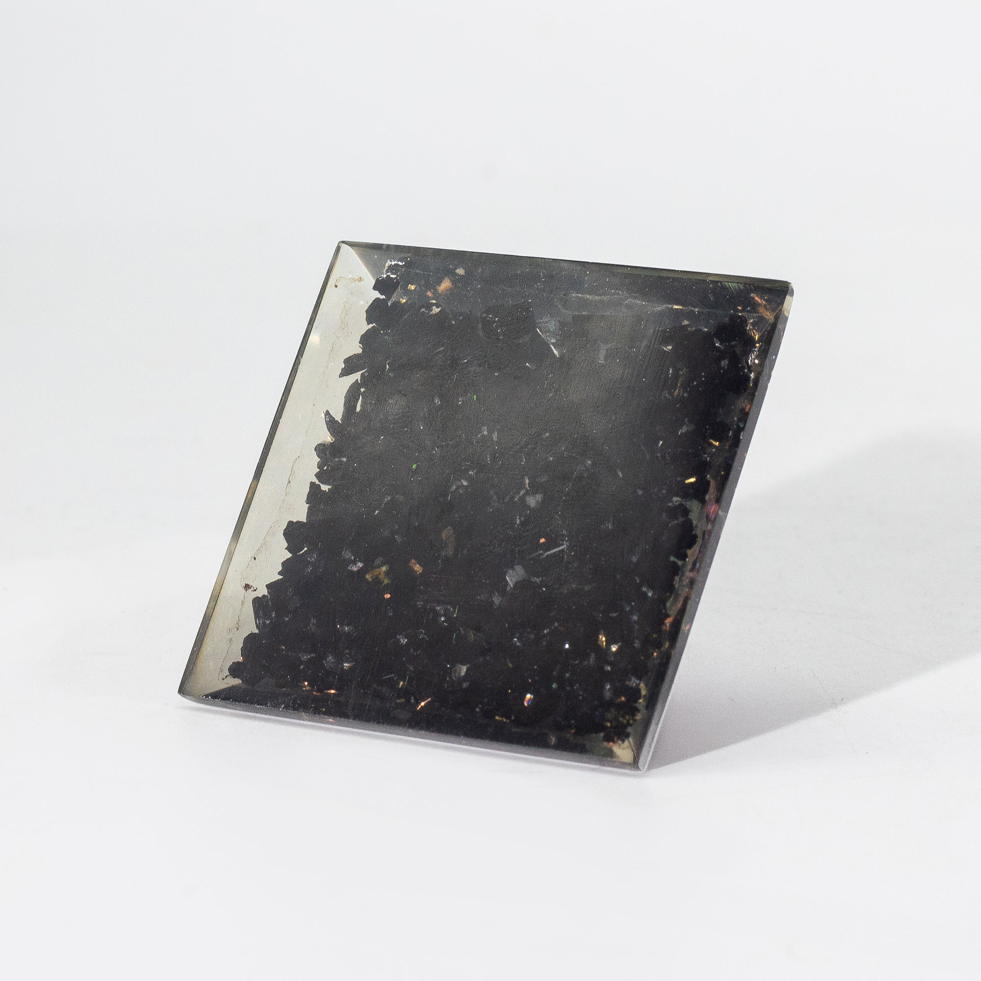 Varje pjäs är noggrant handgjord av en blandning av harts, metallspån och äkta halvädelstenar. Pyramiden har den heliga symbolen Livets Blomma och skyddande svarta turmalin-chips, som värderas för sina jordande och energiskärmande egenskaper. Pyramiden bildar en kraftfull orgonitstruktur som tros främja energisk harmoni och skydd.