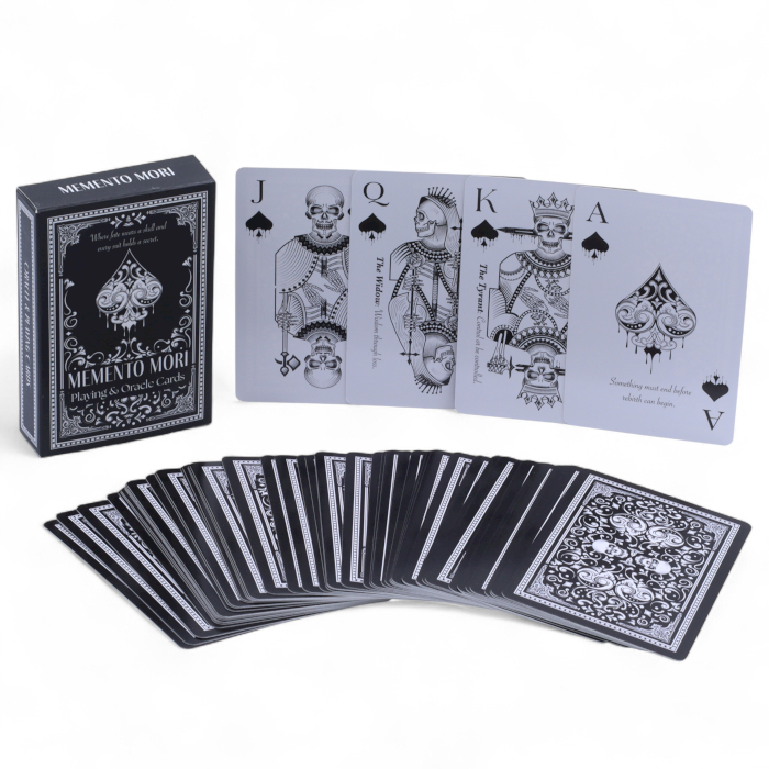 Varje lek innehåller 52 standardkort plus 2 jokrar, tryckta på högkvalitativ kartong och papper för slät hantering och långvarig användning. Memento Mori-designen är prydd med intrikata skallmotiv och tidlösa gotiska utsmyckningar – ett perfekt val för kunder som dras till det mystiska.