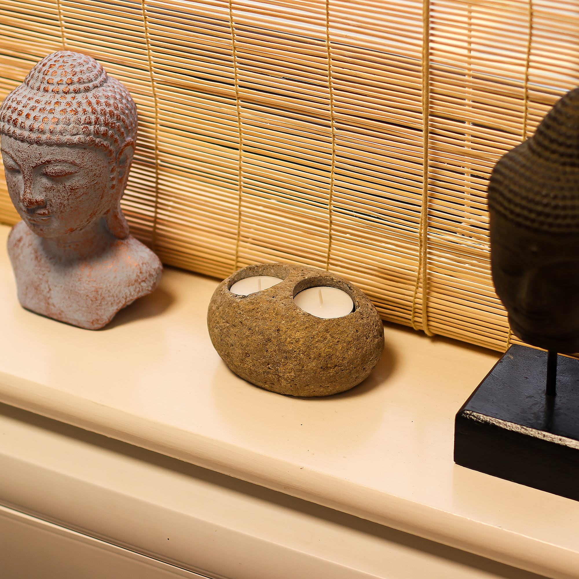 Varje produkt är unik och visar upp den naturliga texturen och tonen hos stenen den skars från. Den är utformad för att hålla två värmeljus, och är idealisk för att skapa en mjuk, lugn atmosfär — perfekt för avslappningshörnor, wellness-utställningar eller naturinspirerade presentsamlingar.