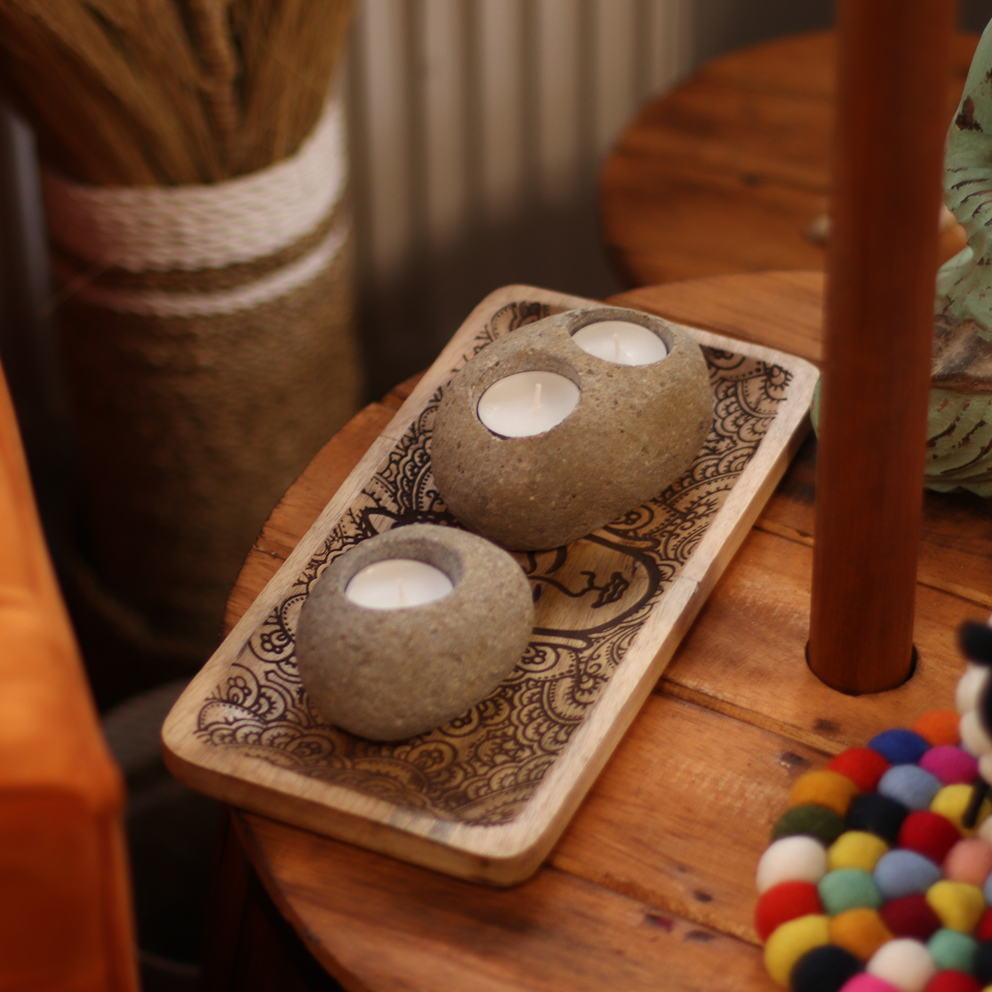 Denna handgjorda dubbla ljushållare, tillverkad av äkta flodstenar, skapar enkel harmoni och balans i varje utrymme.