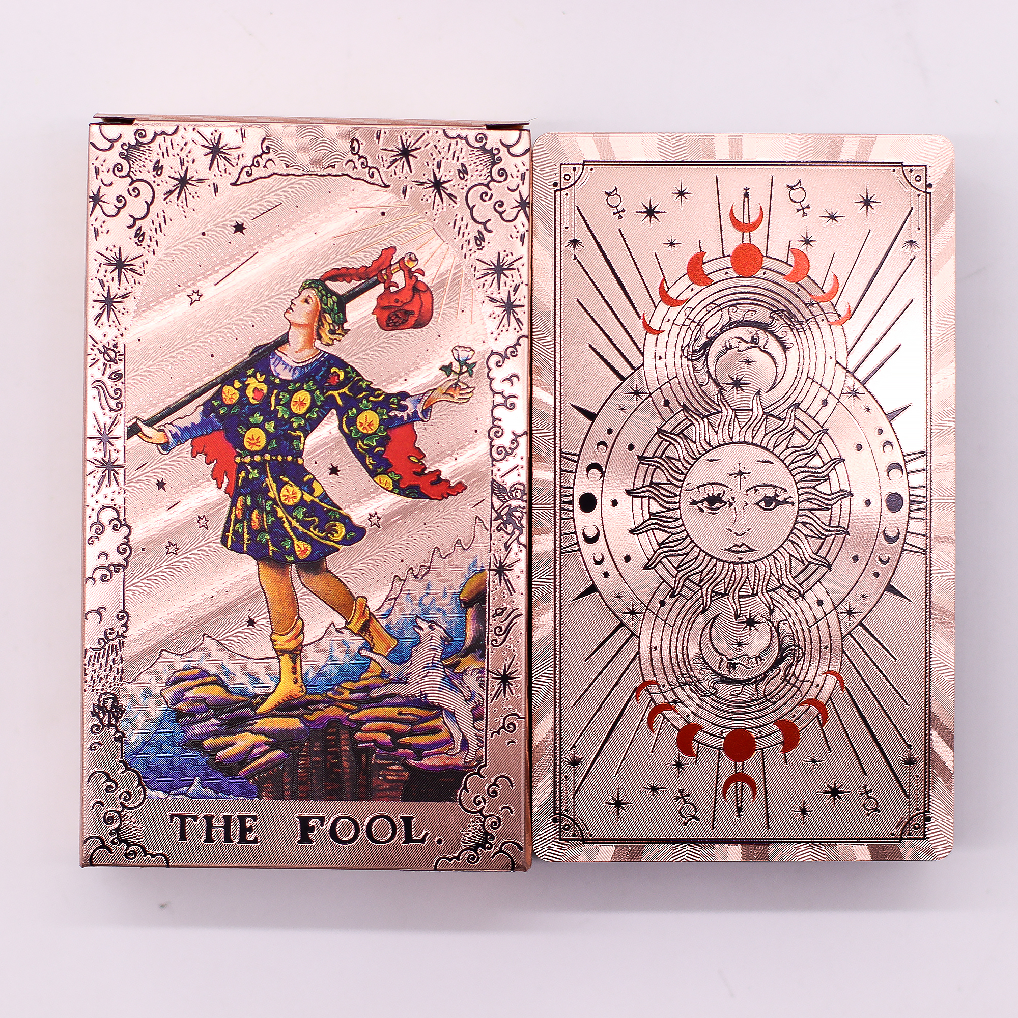 Denna kompletta 78-korts lek har klassisk tarotbildspråk förstärkt med roséguldfolie tryckt på ett slätt, hållbart kortmaterial utformat för frekvent användning. Det eleganta månfas-temat förenar symbolisk mening med himmelsk skönhet, allt förpackat i en snygg förpackning som inkluderar ett guidehäfte.