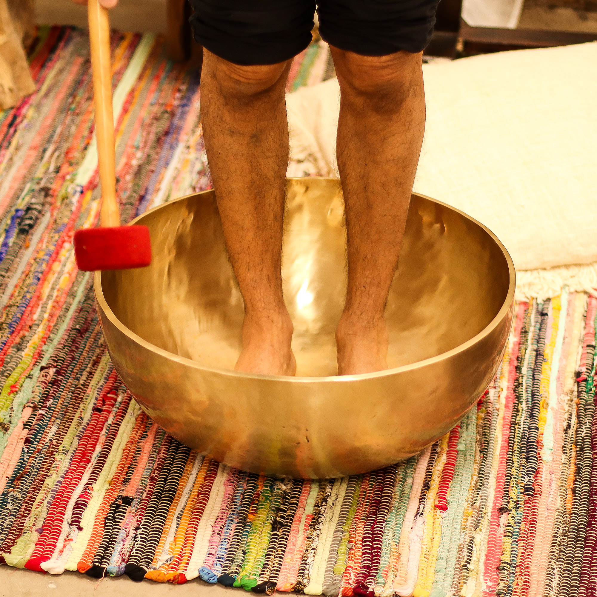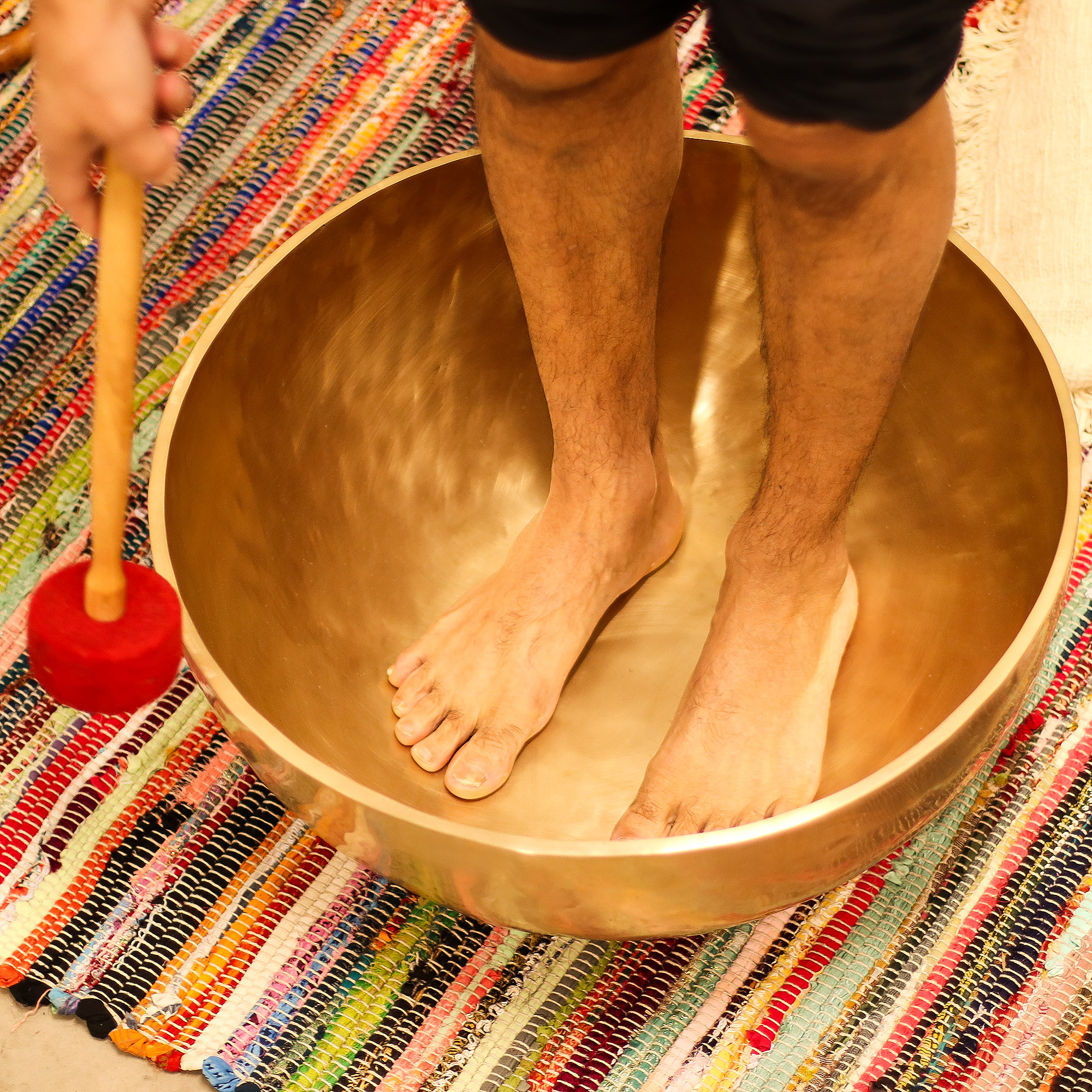 Skålen är utformad för den traditionella praktiken att stå inuti vibrationen, och producerar låga, resonanta toner som försiktigt färdas genom fötterna och upp i kroppen. När den spelas eller slås an främjar ljudet jordning, lugn och ett meditativt tillstånd, ofta associerat med Himalaya ljudterapi.