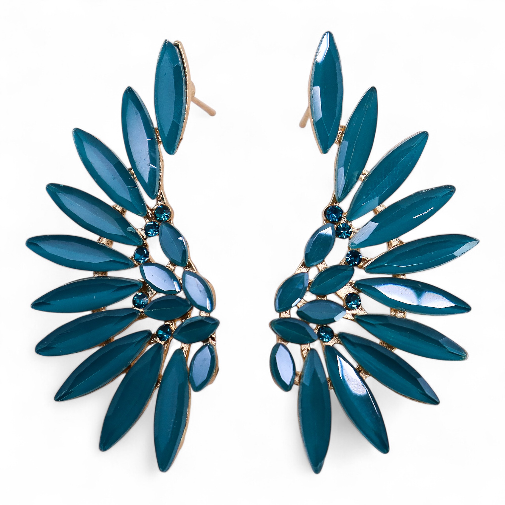 Dessa Änglavingeörhängen uppvisar djupa petrolgröna glasaccenter som skimrar med djup. Vingdesignen symboliserar rörelse och frihet och erbjuder ett slående men ändå bärbart smycke.
